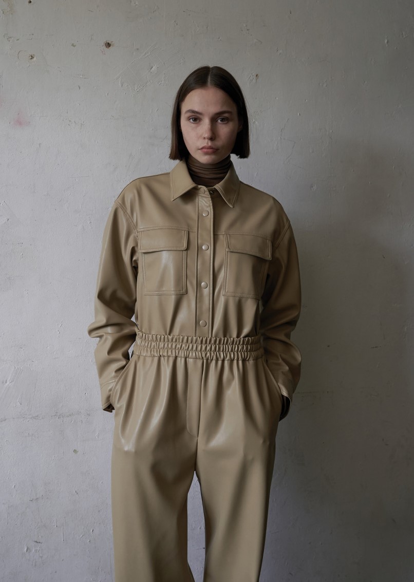 프롬웨얼(Fromwhere) Leather Shirt Jacket Beige. -Leather lounge pants와 동일한 원단으로 함께 스타일링 가능 -소프트한 텍스처로 환경까지 고려해 제작한 페이크레더 셔츠자켓 -셔츠와 자켓 두가지의 스타일