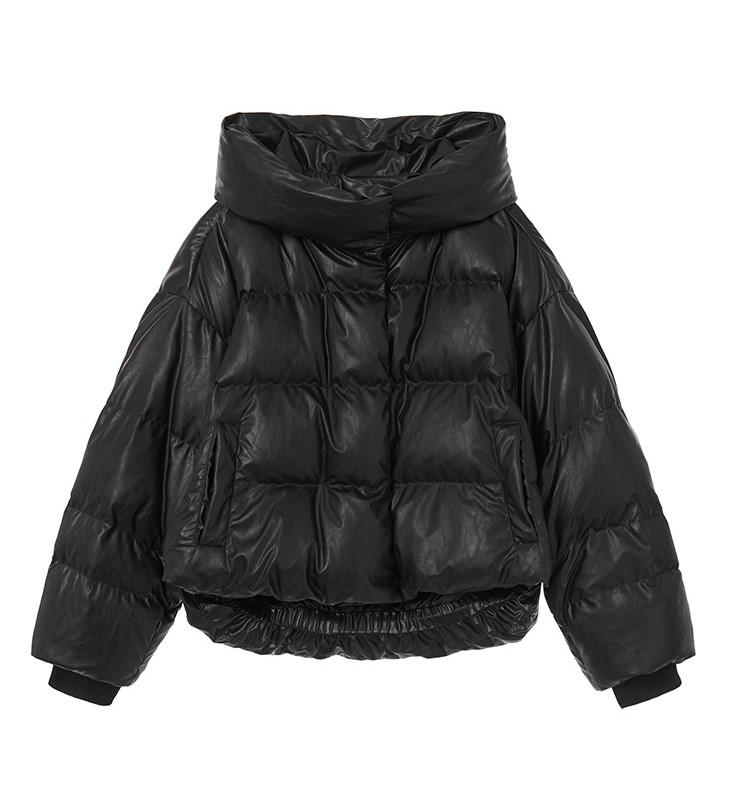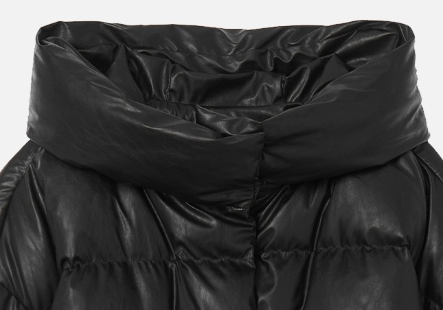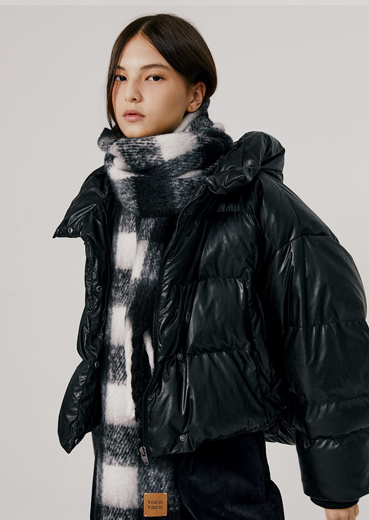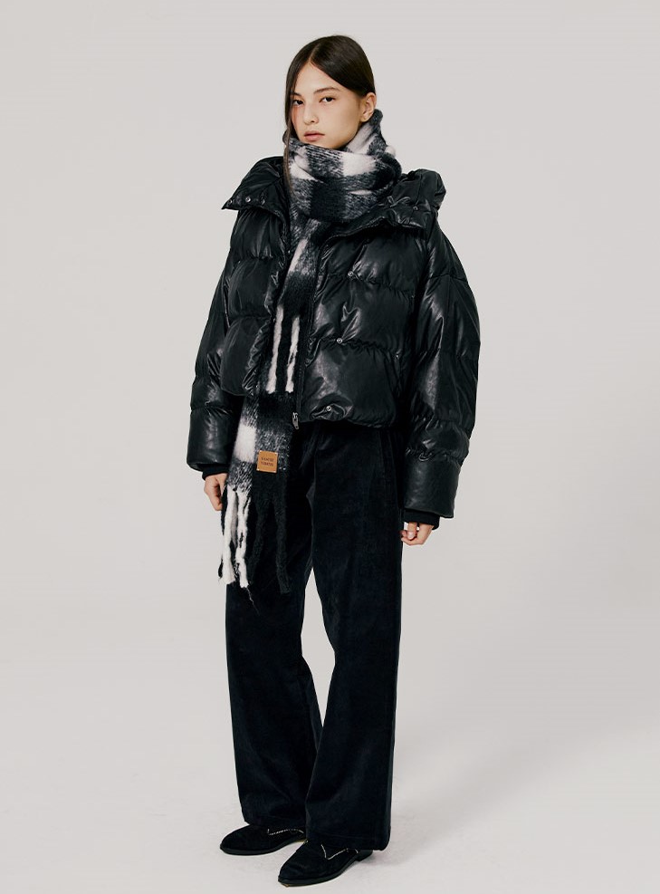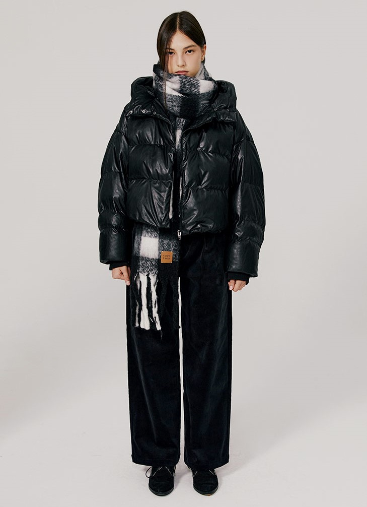 입체감 있는 풍성한 퀼팅라인과 인조가죽의 부드러운 텍스쳐가 돋보이는 크롭 기장감의 트렌디한 구스다운점퍼입니다.