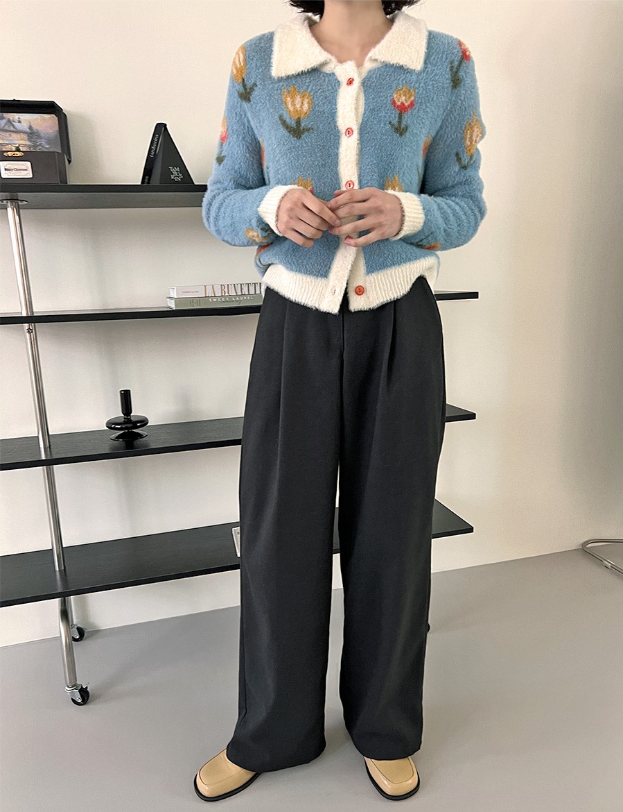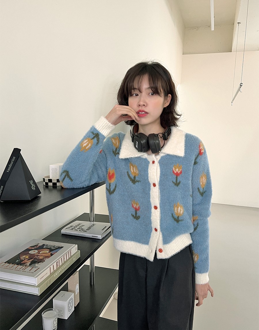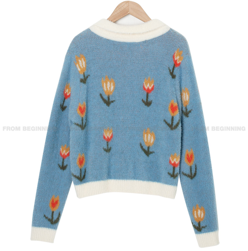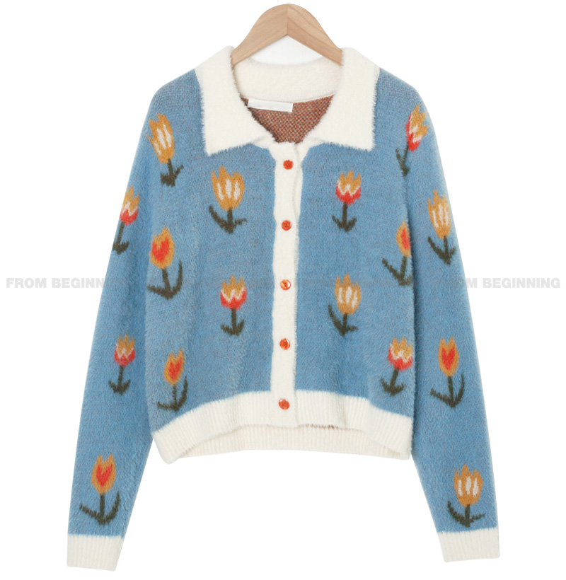 키치한 무드의 튤립 패턴 브러쉬 카라 가디건입니다.