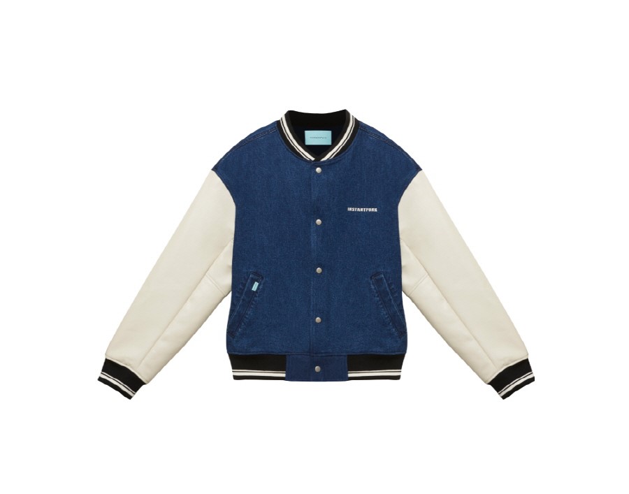 INSTANTFUNK 21FW 1/4 Collection 클래식한 무드의 세미 오버핏 데님 스타디움 점퍼입니다. 데님과 에코 레더 원단이 믹스 매치되어 있으며, 스톤 워싱 가공을 통하여 빈티지한 느낌과 부드러운 터치감을