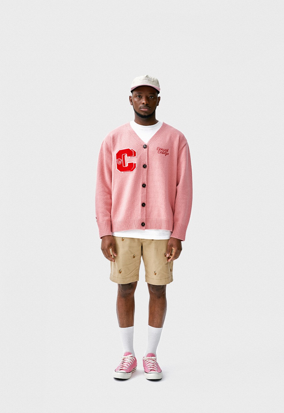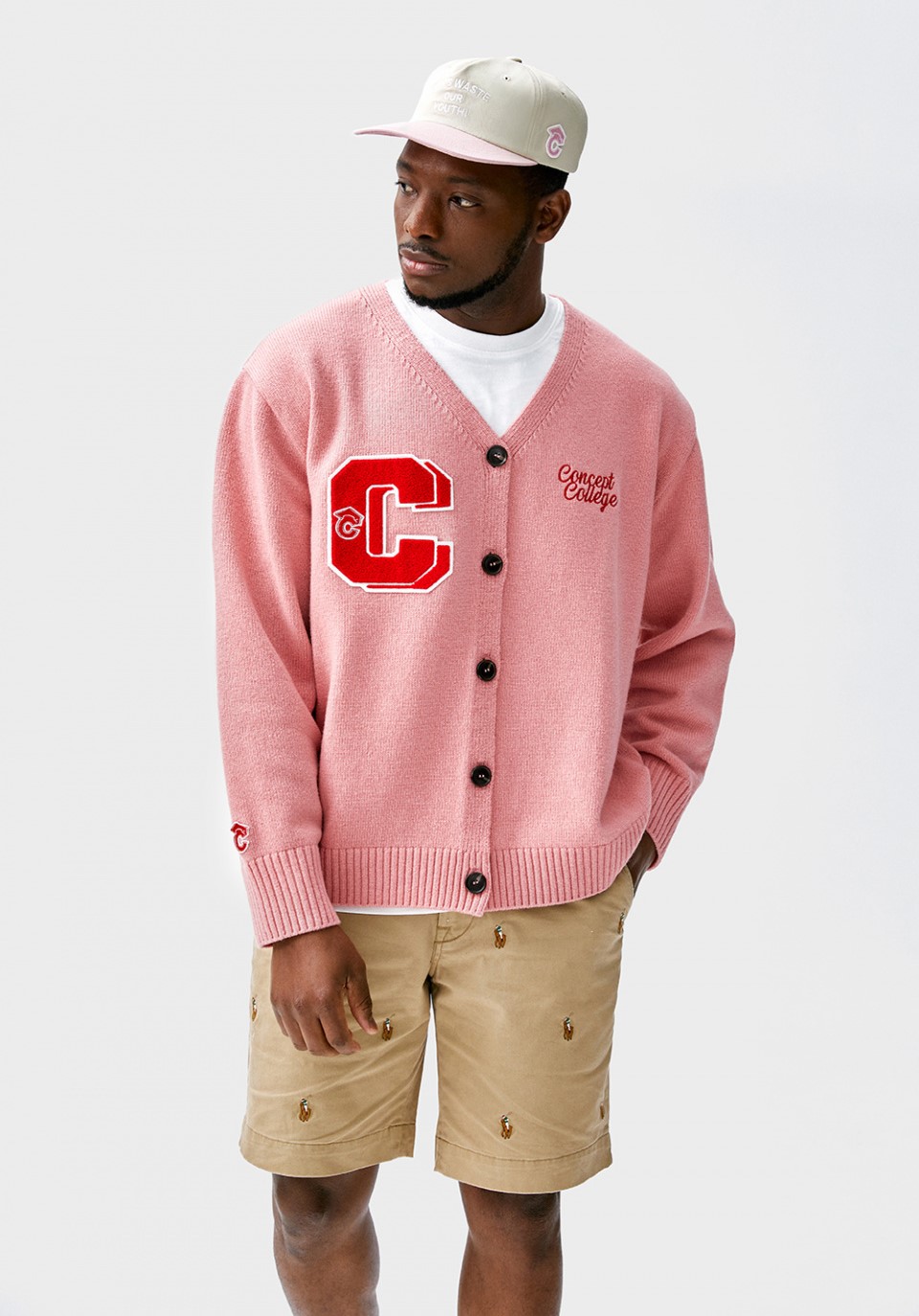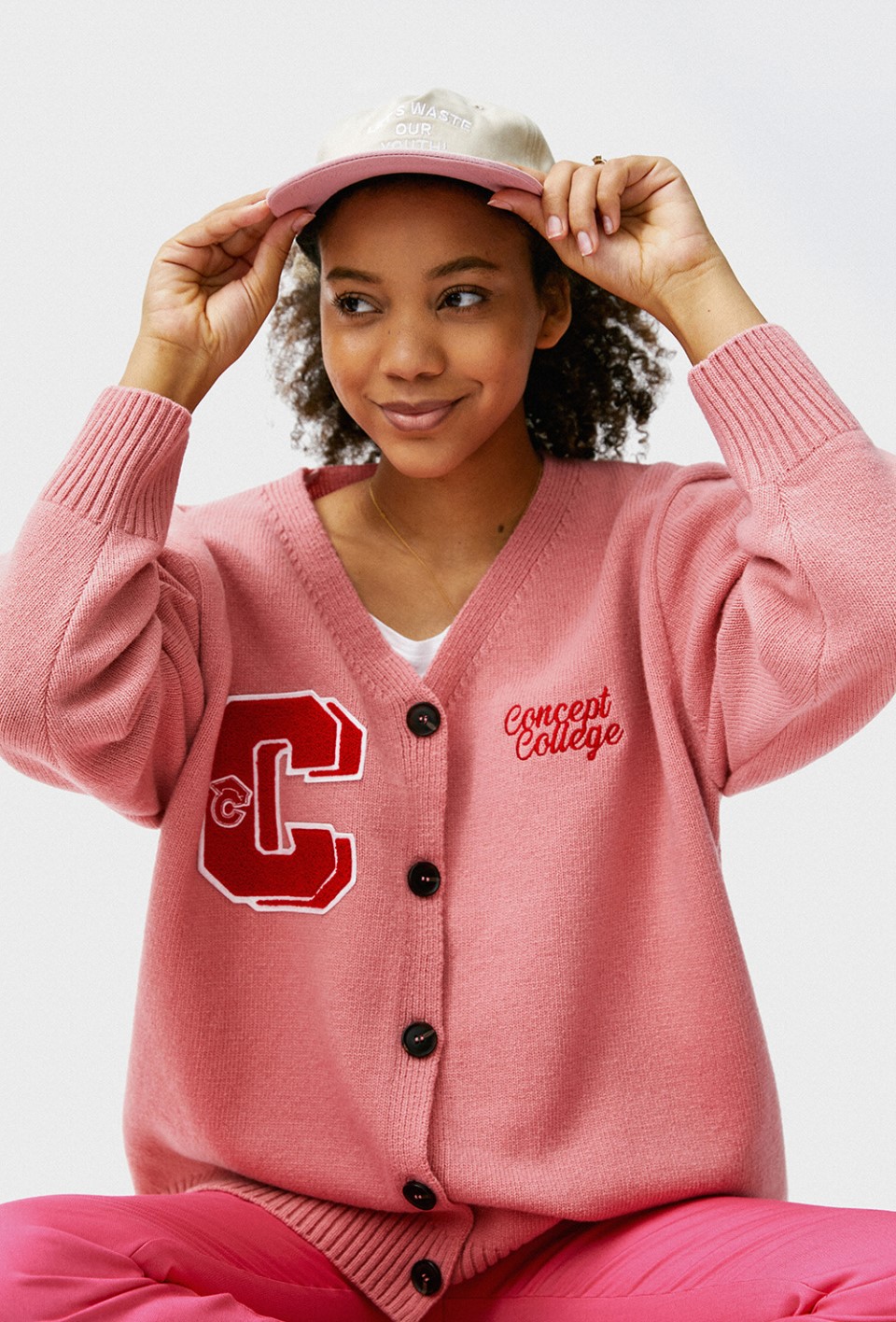 컨셉트 컬리지의 새로운 더블 C 패치가 돋보이는 파스텔 핑크 컬러의 램스울 니트 가디건입니다.
