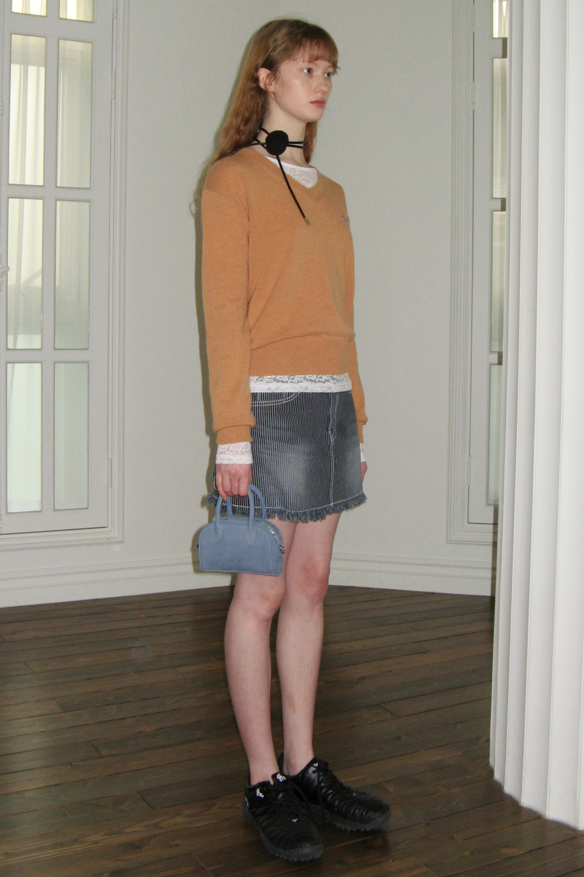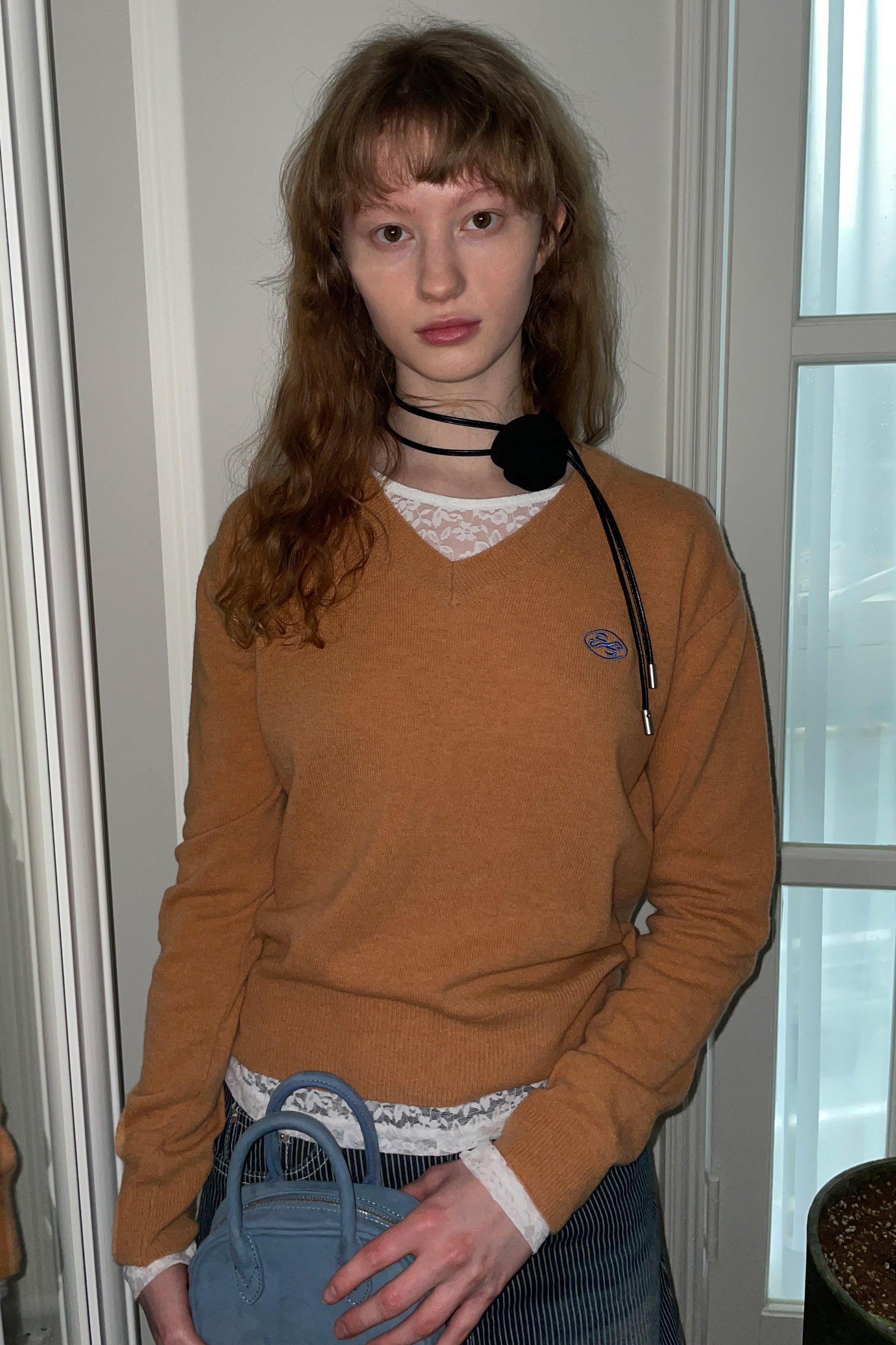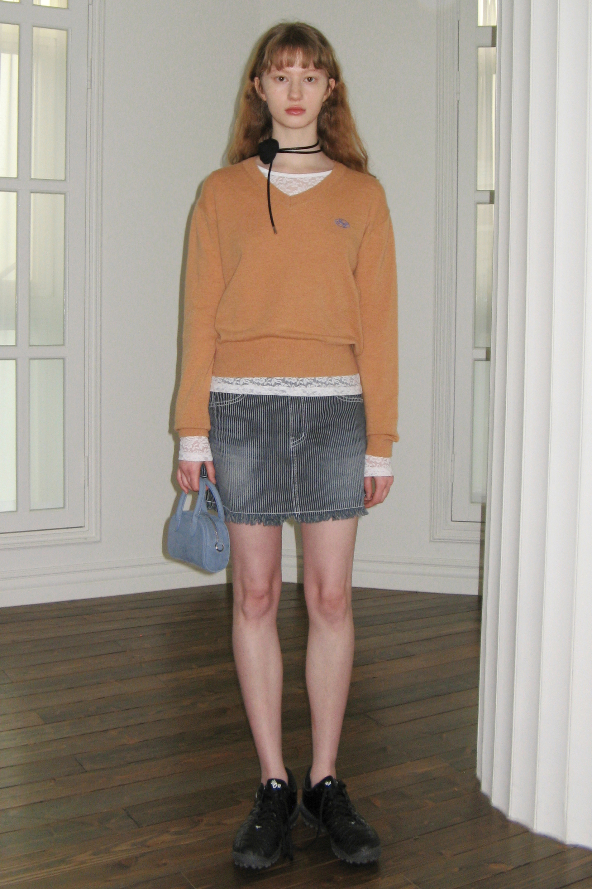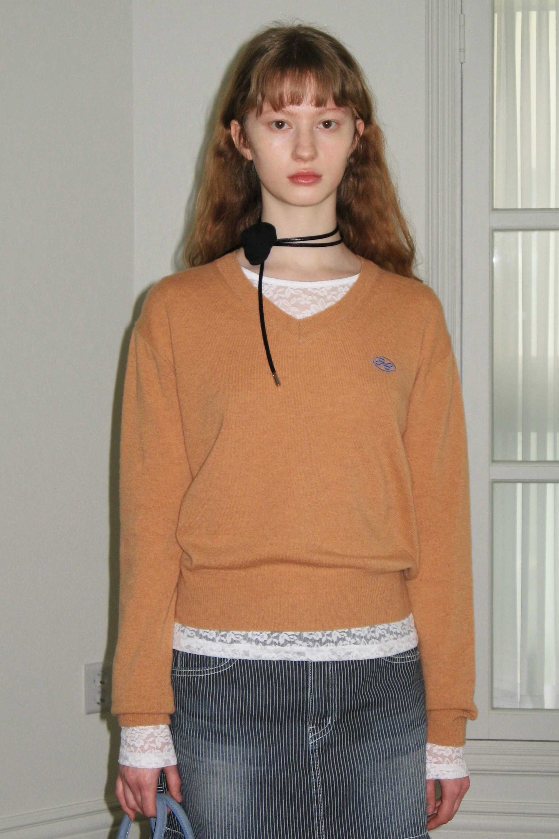 [SINOON] RIBBON LOGO V-NECK KNIT (ORANGE CREAM) : 더블유컨셉