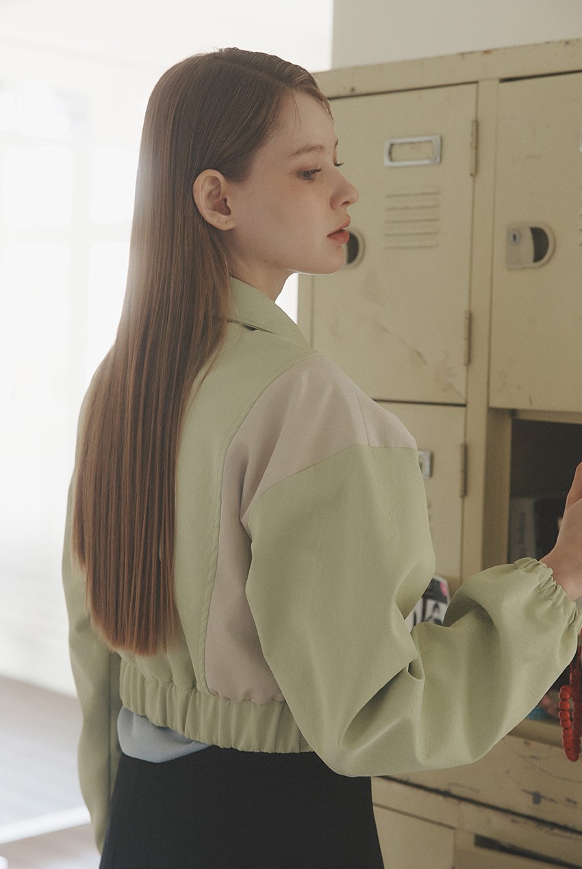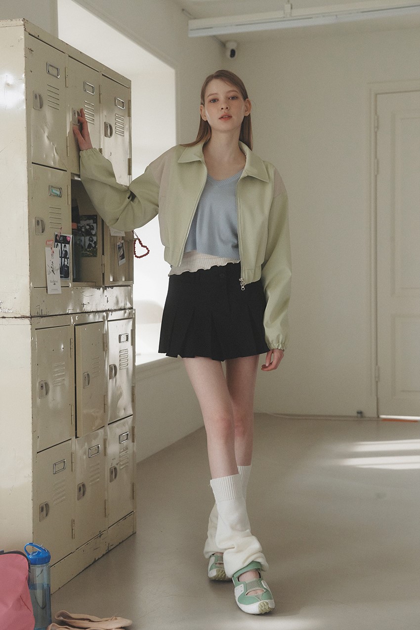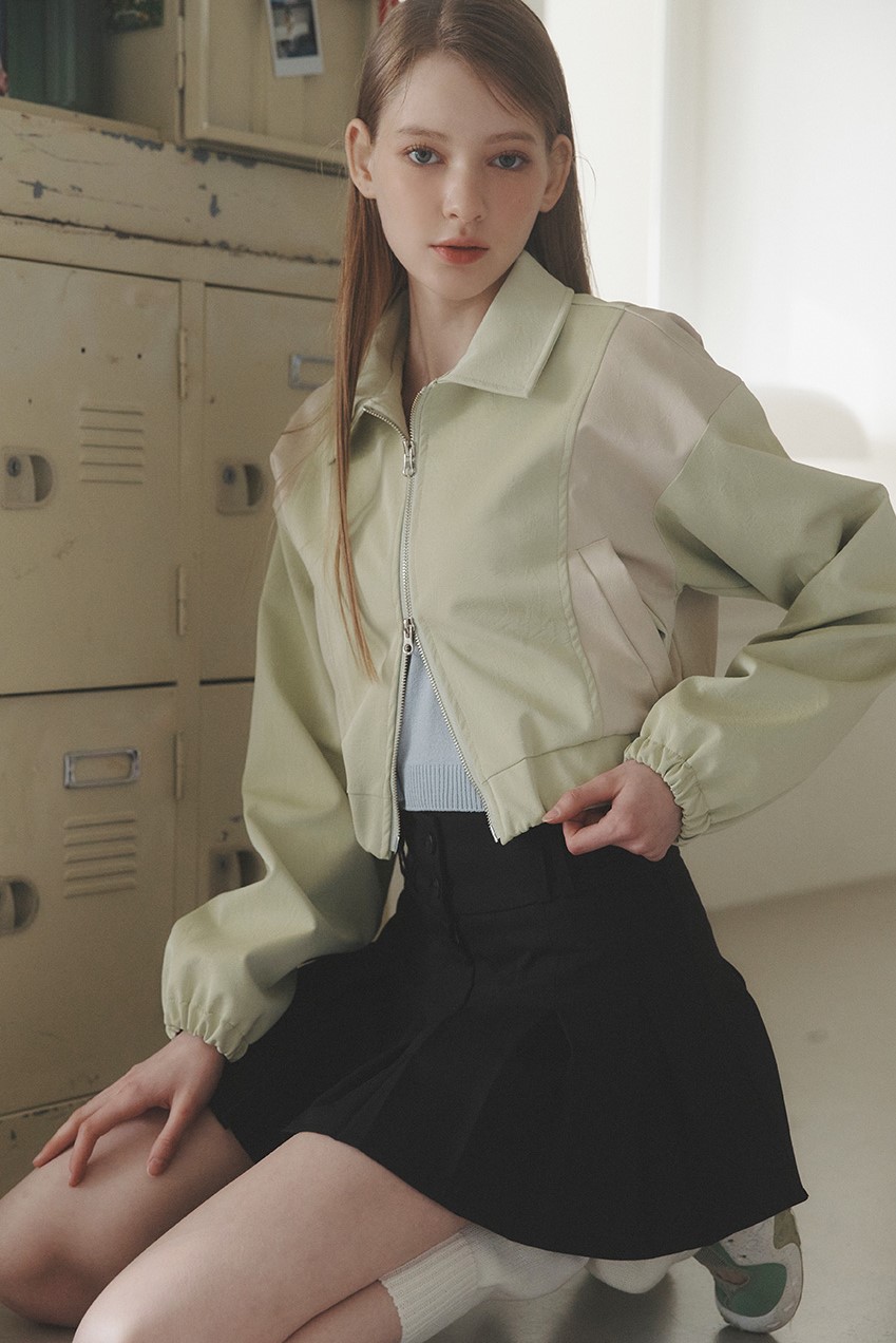 어깨에서 밑단까지 컬러 배색을 준 레더 봄버 자켓입니다.
