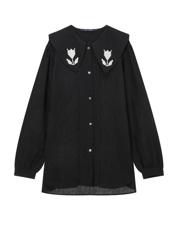 소피 드 후레의 블랙 자수장식 린넨 긴팔 블라우스는 린넨 소재의 시원하고 편안한 착용감과 자수 장식의 포인트로, 다양한 스타일에 활용하기 좋은 제품입니다.