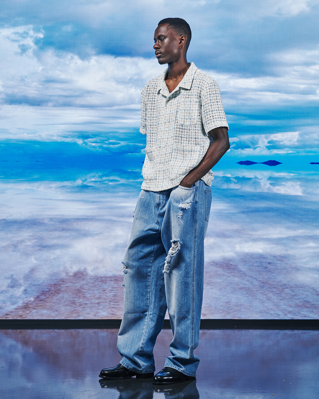- 데님 팬츠, 스니커즈와 함께 캐주얼룩 연출