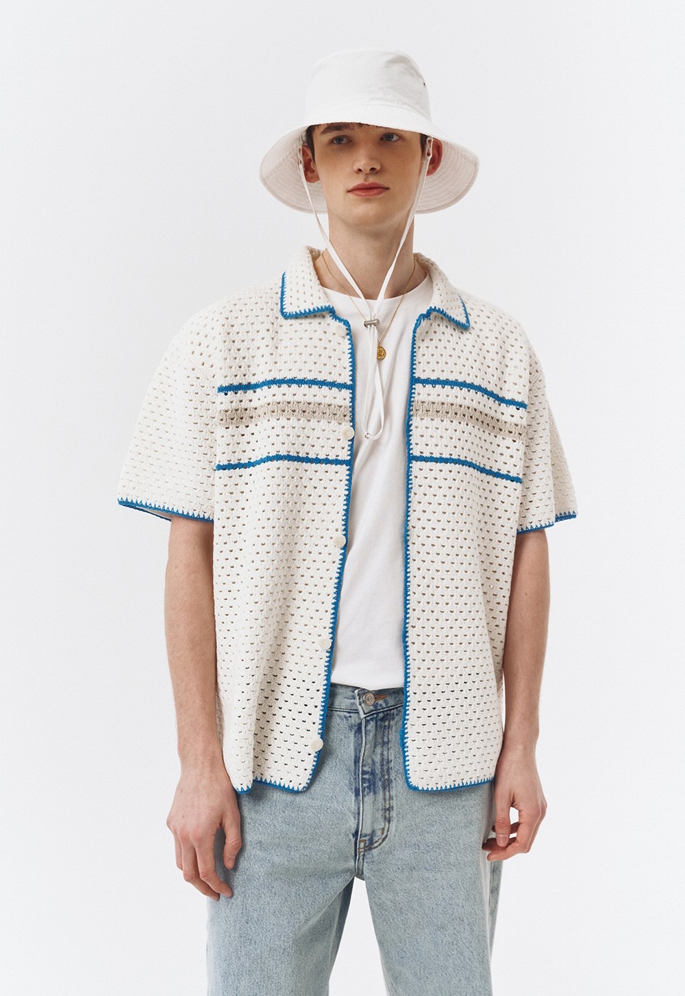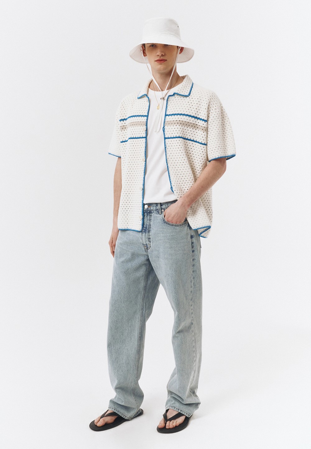 블루 컬러는 여름에 잘 어울리는 컬러입니다. 부드러운 블루 컬러의 던스트 크로셰 니트는 청량한 느낌을 주며, 다양한 스타일링에 매치하기 좋습니다.